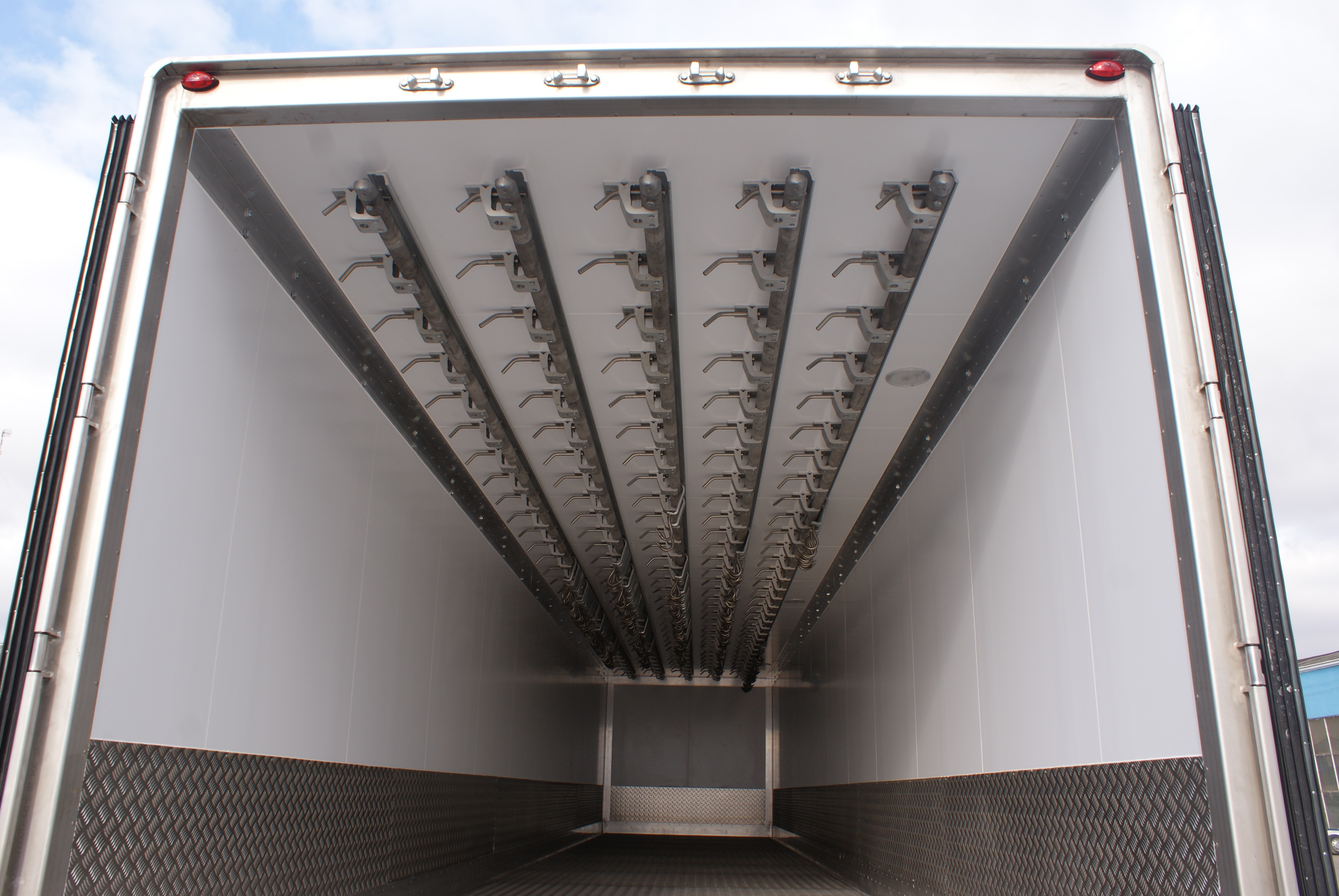 Внутренне оборудование фургона: система подвешивания крюков (направляющие) из нержавеющей стали. Держатели, концевики, фиксаторы импортного производства Pastore&Lombardi. Есть возможность альтернативного варианта подвеса с использованием профильных направляющих, что удешевляет стоимость фургона, но имеет ряд эксплуатационных ограничений - основной - отсутствие возможности подключения к транспортеру.